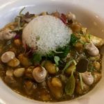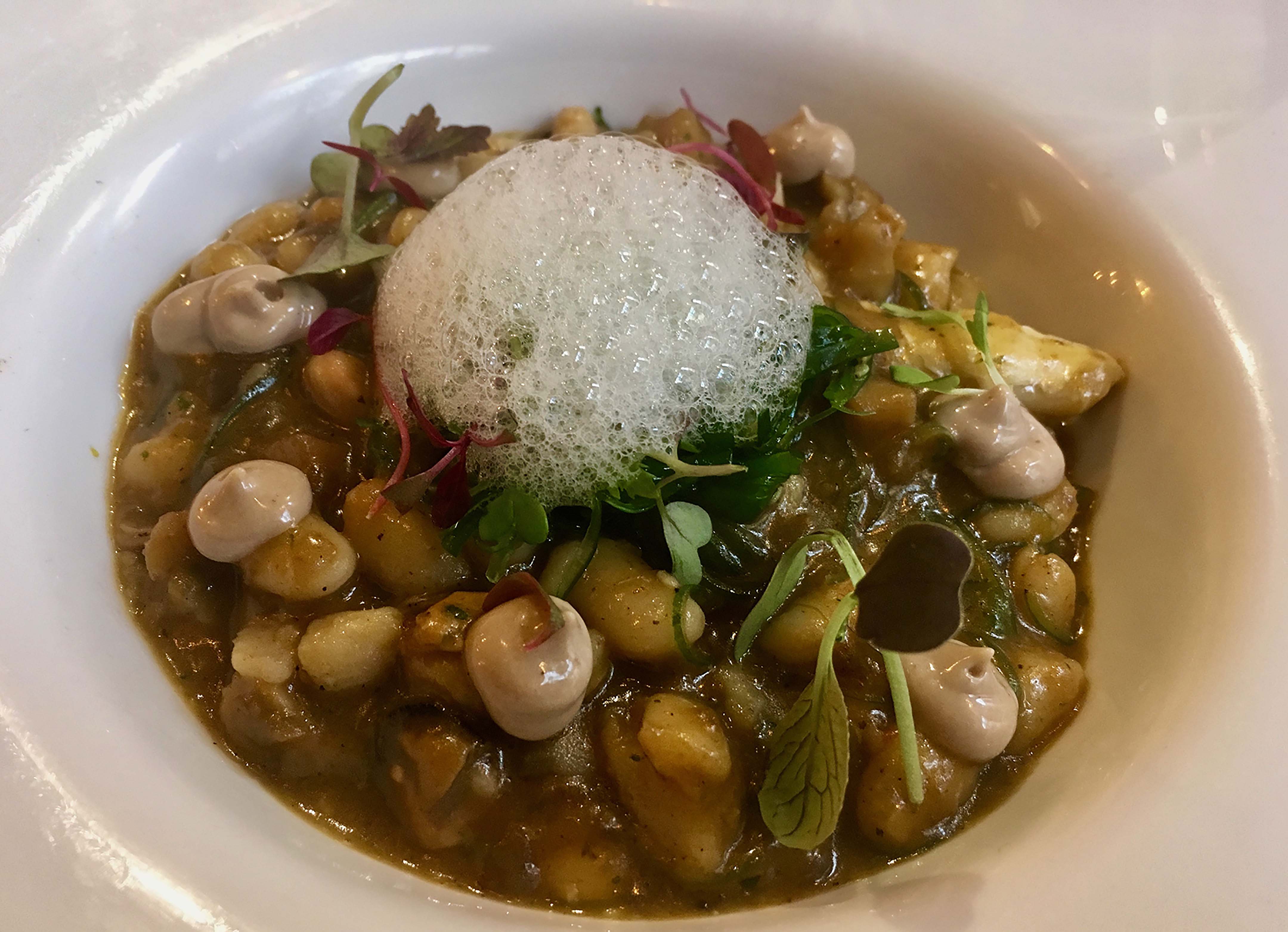 Entre els primers plats que vam poder degustar trobàvem l’Amanida de gules, pernil ibèric i bolets; Paccheri, salsa de tres formatges, pera i espinacs; Croqueta XXL carnívora, verdures al wok i enciams; o una original Fabada del mar consistent en una gustosa cassoleta de mongetes blanques amb gambes, calamars, cocotxes i aire de l’alga wakame.