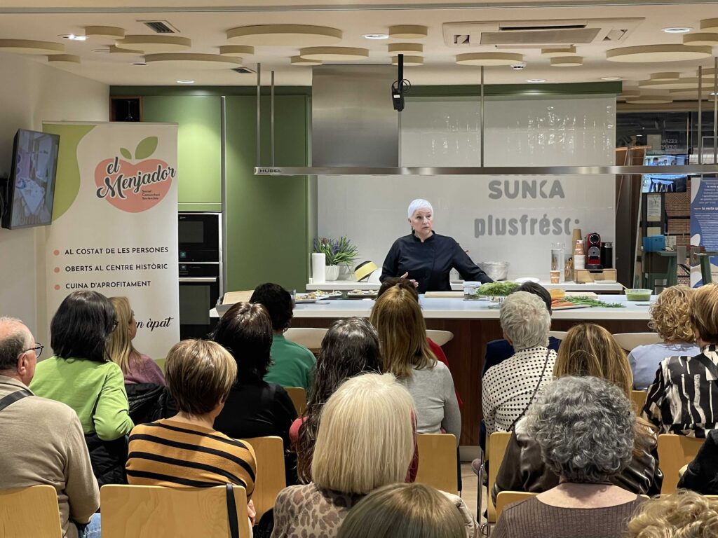 La cuinera i formadora Mercè Camins, ha estat la protagonista avui dimecres, dia 4 de maç, del primer taller de Cuina d’Aprofitament del cicle de dones cuineres que organitza el Banc dels Aliments de Lleida i la Fundació Jericó a la Sala Sunka en el marc de la campanya “- la resta que suma +”. Camins ha explicat com aprofitar millor els aliments, així com ha elaborat i donat a tastar, en petites degustacions, diferents receptes amb productes de temporada com l’escarola.