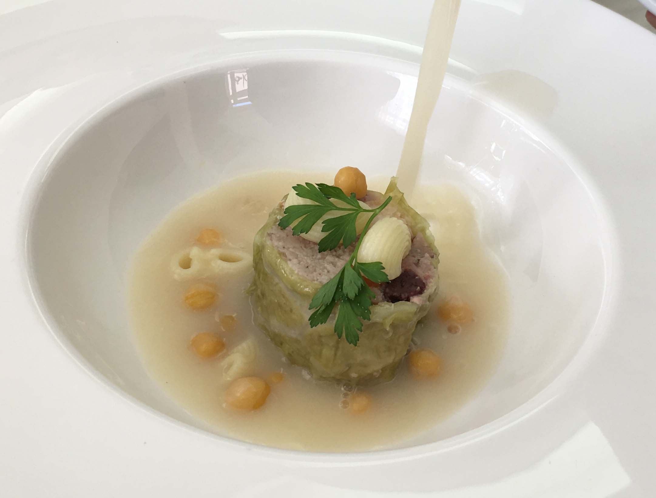 Escudella y cocido con su caldo casero; y Pollo relleno con cremoso de patata y melocotón de Alfarràs; fueron los platos principales del menú que se sirvió en el evento. Un menú con marcado acento leridano y elaborado por los alumnos de ESCHOTUR que se completó con un postre, también con sabor local, con Pera de Lleida y, finalmente, Turrones.