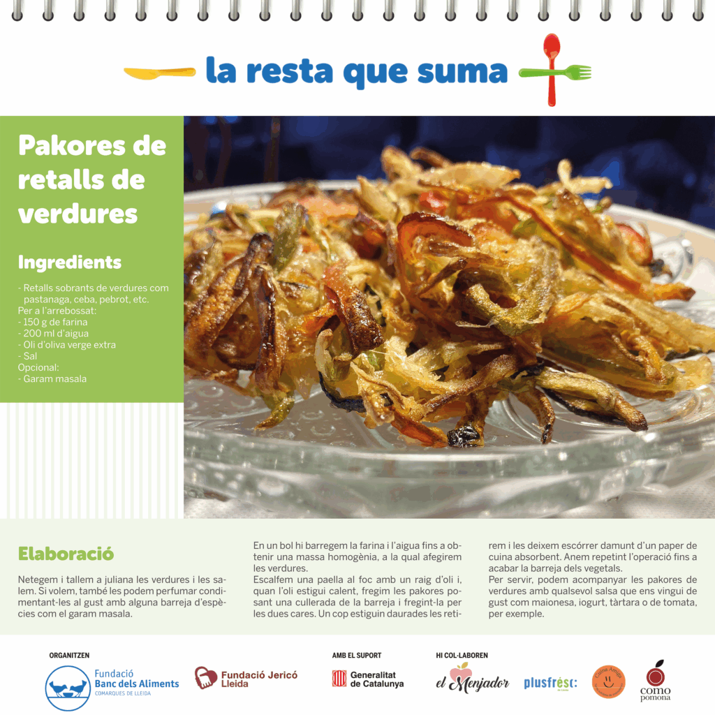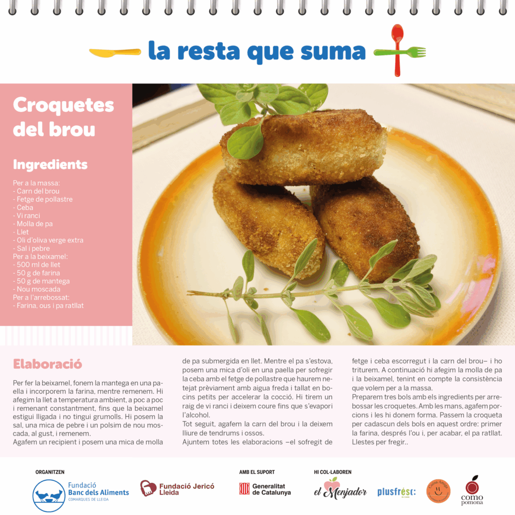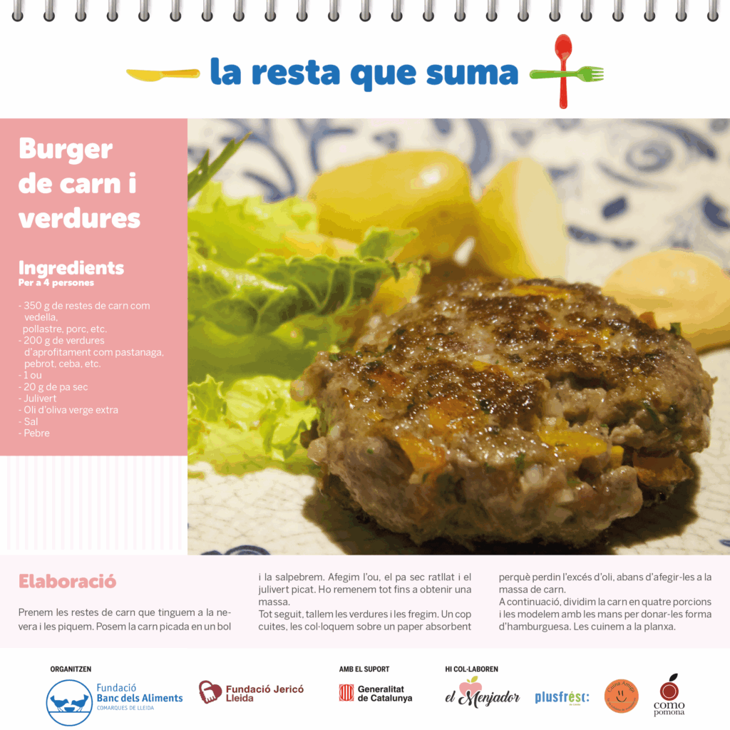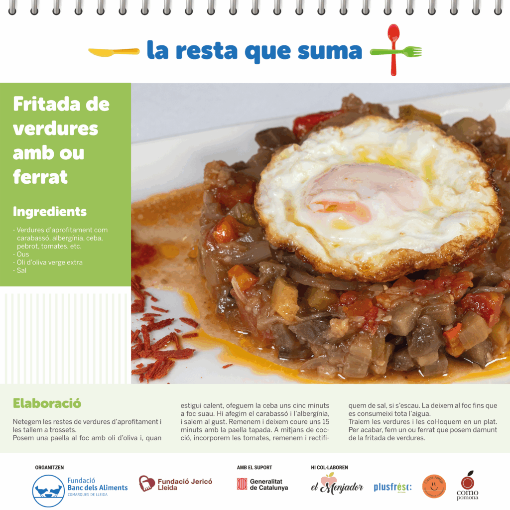 El fet d’aprofitar els aliments amb una gestió sostenible i responsable –i si és convenient amb un segon i tercer ús, abans de deixar que es facin malbé– és la millor via per evitar el malbaratament. És per això que, amb – la resta que suma +, el Banc dels Aliments de les Comarques de Lleida i la Fundació Jericó, gestors mancomunats de l’espai comunitari El Menjador, ens interpel·len per esdevenir agents actius en aquesta lluita. La mostra té el suport de la Generalitat de Catalunya i la col·laboració dels cuiners del col·lectiu Cuina Amiga que participen cada any en la campanya “Diumenge cuino jo”, a benefici d’El Menjador; i que aporten algunes de les recomanacions d’aprofitament alimentari recollides en el llibre “Cuina Amiga. Fogons Solidaris” i receptes per incorporar l’hàbit de l’aprofitament en el nostre dia a dia.