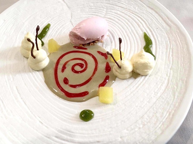 Los entrantes han sido Lentejas “beluga”, cigalas y caracoles, y los mencionados Caracoles a la Antigua. Como platos principales, de pescado, Bacalao asado, sopa de cebolla y ravioli de caracoles; y de carne, Lingote de “Ternasco” de Aragón, crema de raíces y caracoles.