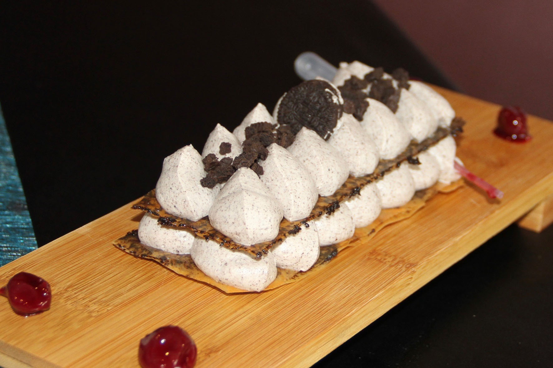 A la hora de los postres, Copa de requesón de cabra con nueces y crujiente de miel; Bombas de chocolate con crema de mango y textura de coco; Coulant de pasas y Armanyac, con helado de crema de licor y tierra de avellanas; la estrella de la casa, Milhojas de galleta con salsa de cerezas confitadas; y el Mojito, crema de limón y menta, helado de azúcar moreno y aire de ron.