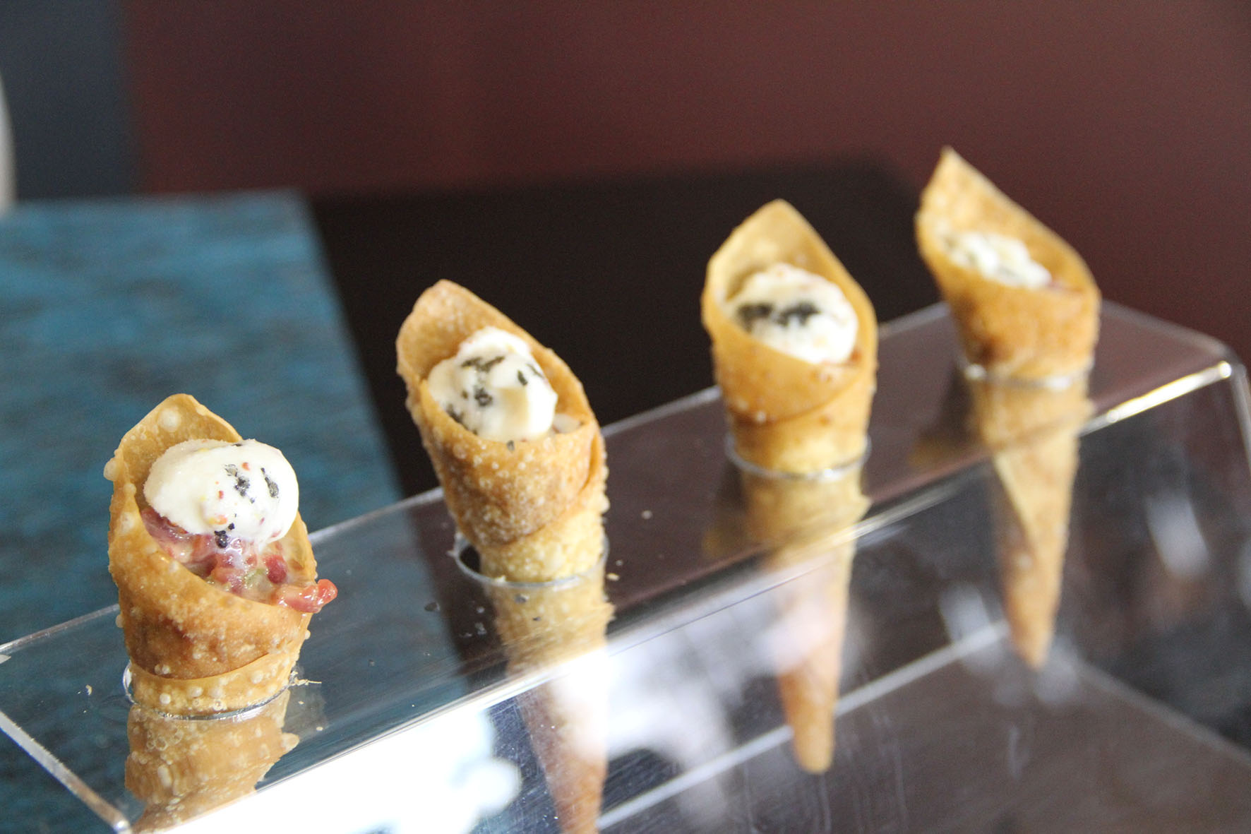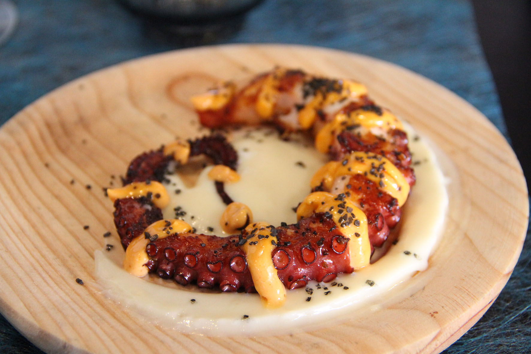El Pop a la brasa amb parmentier de patata fumada i maonesa de pebre vermell, arriba a la taula sota campana i el servei és molt efectista. Les Patates braves de la casa amb allioli de mel, mojo picón i sal vikinga es fan interessants i imprescindibles pels amants d’aquest plat tan recurrent. L’Steak tàrtar, servit en cornet de pasta wanton i gelat de mostassa, ens resulta una de les tapes més cridaneres pel que fa a la presentació i resultat gustatiu.