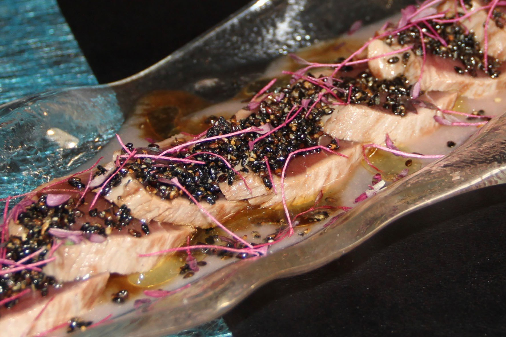 El Canelón de rabo de buey; y el Tataki de atún salvaje, crema de melocotón y salsa de soja con sésamo son otras de las especialidades que probamos.I Y cerramos los platos principales con “Chuletón” marinado con nuestra “chimichurri”.