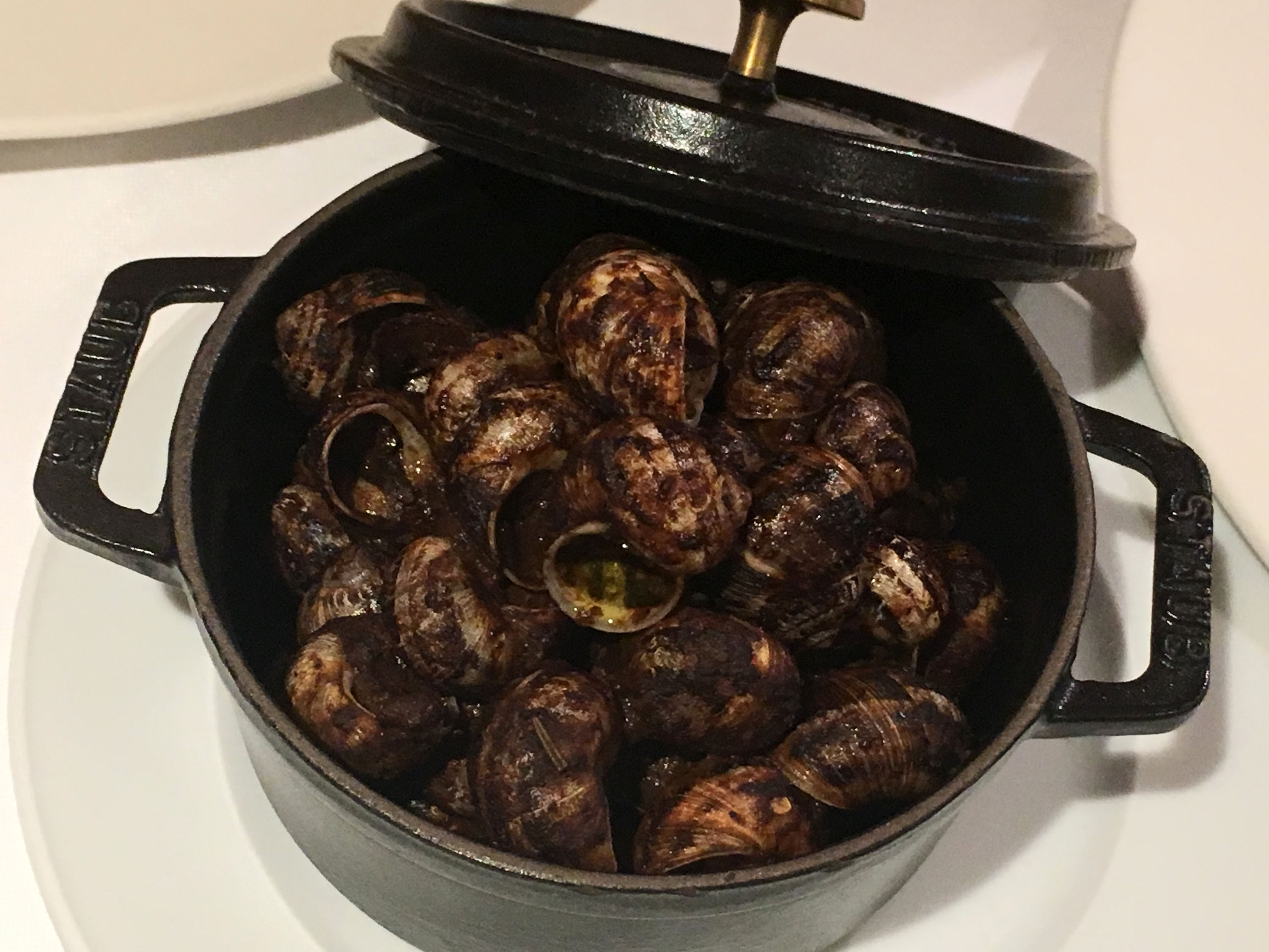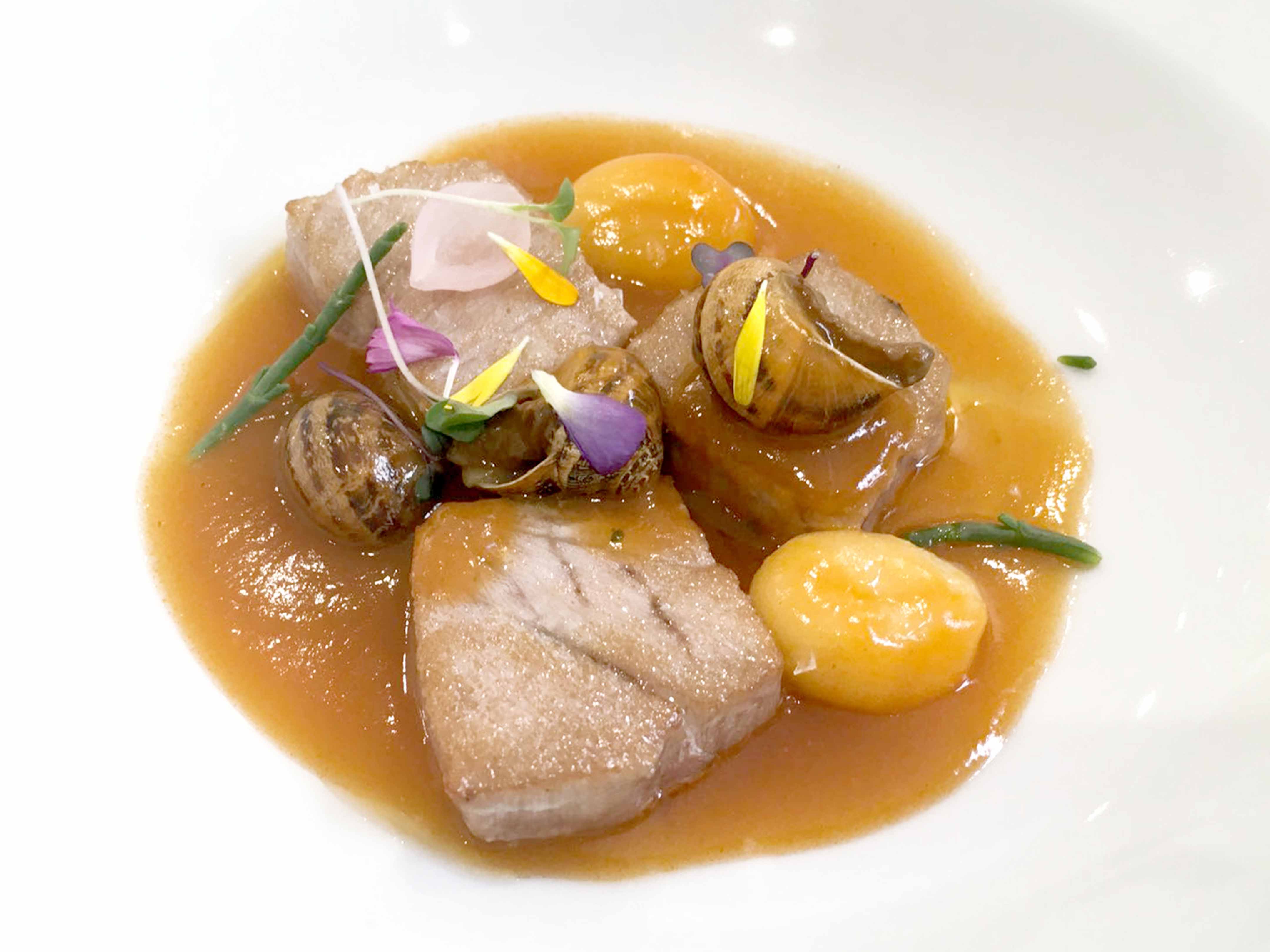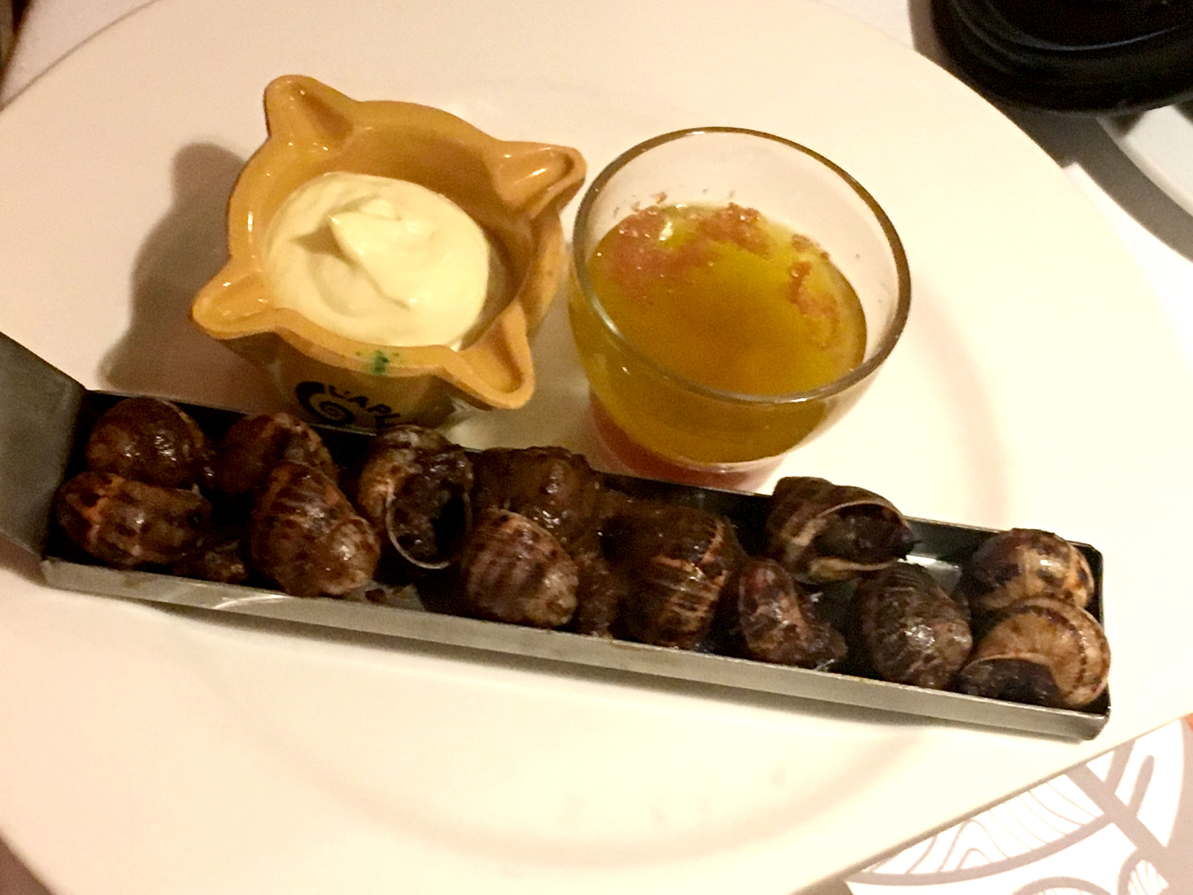 Este menú, diseñado y confeccionado por la Escuela leridana para la promoción de la cocina del caracol y la fiesta se iniciaba este año con unos aperitivos como Paté de caracol con alioli de pera; “Cabeza y Pata” con caracoles; Buñuelos de bacalao con caracol confitado y sal negra; y Croquetas de caracol. A continuación se sirvió la tradicional “Llauna” de caracoles, en este caso a la gormanda, y una Cazuela de caracoles dulces y picantes. Los platos principales de estos almuerzos institucionales: “Trinxat” de col con morcilla, caracoles y toques de cremoso de patata; y un Bacalao con caracoles. Por último, los postres estaban protagonizadas por una Pera leridana “Bella Helena” con salsa especiada de chocolate. Para acompañar el café: Almendras garrapiñadas; “Orelletes” y Macarons.
