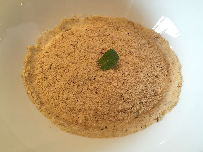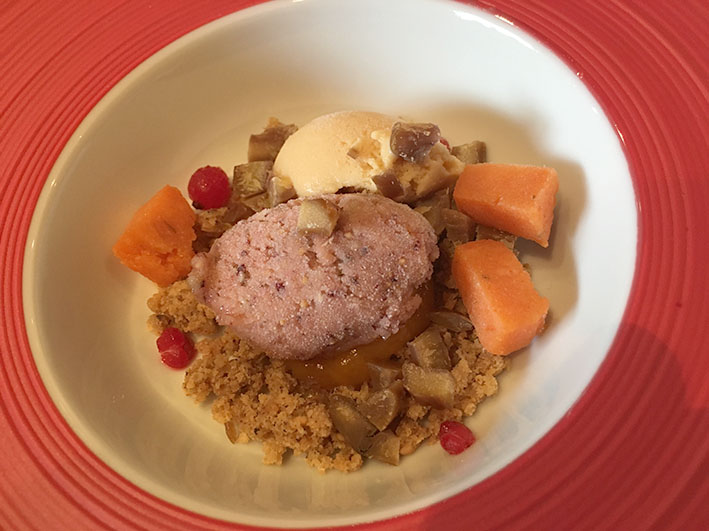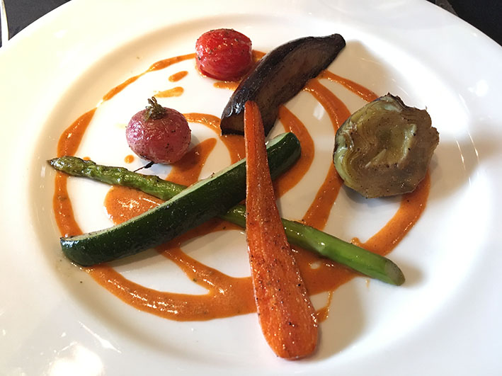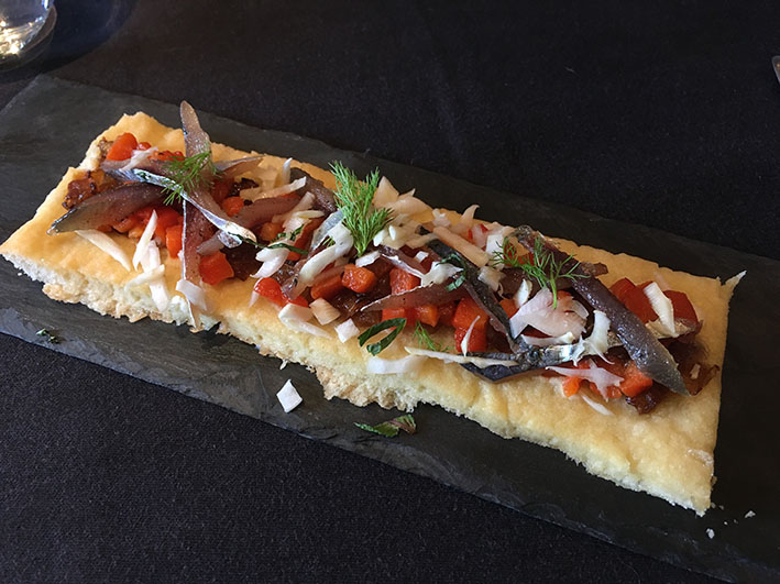 En la degustació d’un menú dedicat a l’oli d’oliva verge extra vam tastar: Coca de recapte amb arengada fumada; Esqueixada embolicada en pasta sobre un llit de taronja, pebrot i oli; “Ajo blanco” amb daus de pernil i pera, tot cobert amb una sorra de ceps; Graellada de verdures cuites a baixa temperatura; una visió molt personal de la Truita amb suc; Entrepà de bao amb Xulla. A les postres, Gelats de figues i caramel, amb dauets de castanyes i moniato; i Tatin de poma.