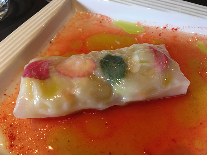 En la degustación de un menú dedicado al aceite de oliva virgen extra probamos: Coca de recapte con arenque ahumado; Esqueixada envuelta en pasta sobre una cama de naranja, pimiento y aceite; “Ajo blanco” con tacos de jamón y pera, todo cubierto con una arena de cepas; Parrillada de verduras cocidas a baja temperatura; una visión muy personal de la Tortilla con jugo; Bocadillo de bao con Chuleta. En los postres, Helados de higos y caramelo, con daditos de castañas y boniato; y Tatin de manzana.