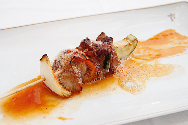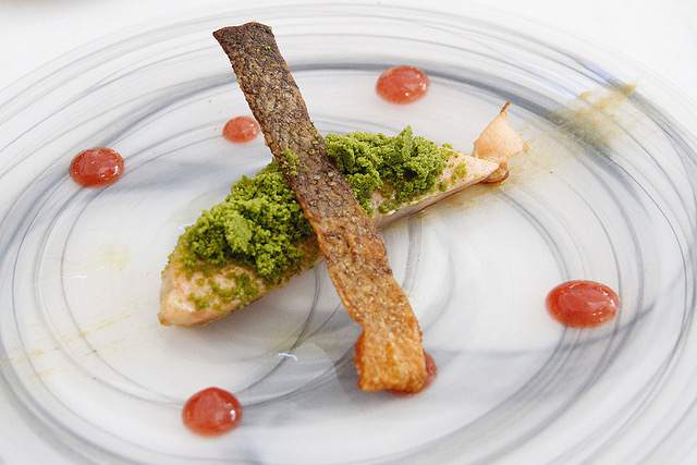 Encontramos diferentes técnicas y juegos de texturas en la Sardina marinada, con ‘torrija’ y requesón; Paté de berenjena a la llama; Alcachofas, en dos cocciones (confitada y frita), con hielo de gambas y jamón ibérico; Gambas con tempura y guacamole; Salmón con tierra de perejil, puré de ajo y agridulce de higos; Magret de pato con cremoso de melocotón (o manzana), a la vainilla y remolacha; Carrillera ibérica al vino tinto, con cremoso de coliflor frita y espuma de maní, o la Brocheta ibérica con caramelo de pimiento rojo y aire de romero.