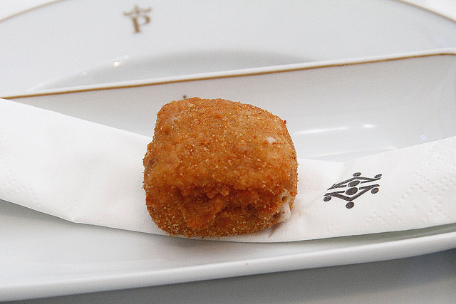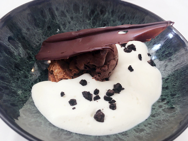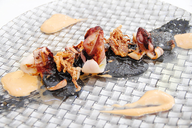 Especial atención a los Chipirones en dos cocciones, con cremoso de foie marino y espuma de tinta. Se trata de un plato que recrea dos recetas diferentes (calamares a la plancha y las patitas a la andaluza) pero que tiene la elaboración de hígado de rape y la emulsión de tinta de calamar como hilo conductor. Muy bien integrado.