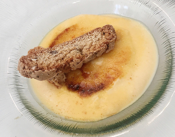 Especial atenció als Calamarsets en dues coccions, amb cremós de foie marí i escuma de tinta. Es tracta d’un plat que recrea dues receptes diferents (calamars a la planxa i les potetes a l’andalusa) però que té l’elaboració de fetge de rap i l’emulsió de tinta de calamar com a fil conductor. Molt ben integrat.