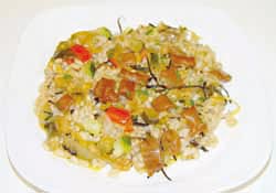 600g de caldo vegetal, 300g de arroz semintegral, 2 tomates, 200g pimiento rojo, 200g calabacín, 200g berenjena, 80g cebolla, perejil y ajo picado (1 cabeza), 1 puñado de algas arame, 1 puñado de algas cochayuyo, 1 buen chorro de aceite y sal.