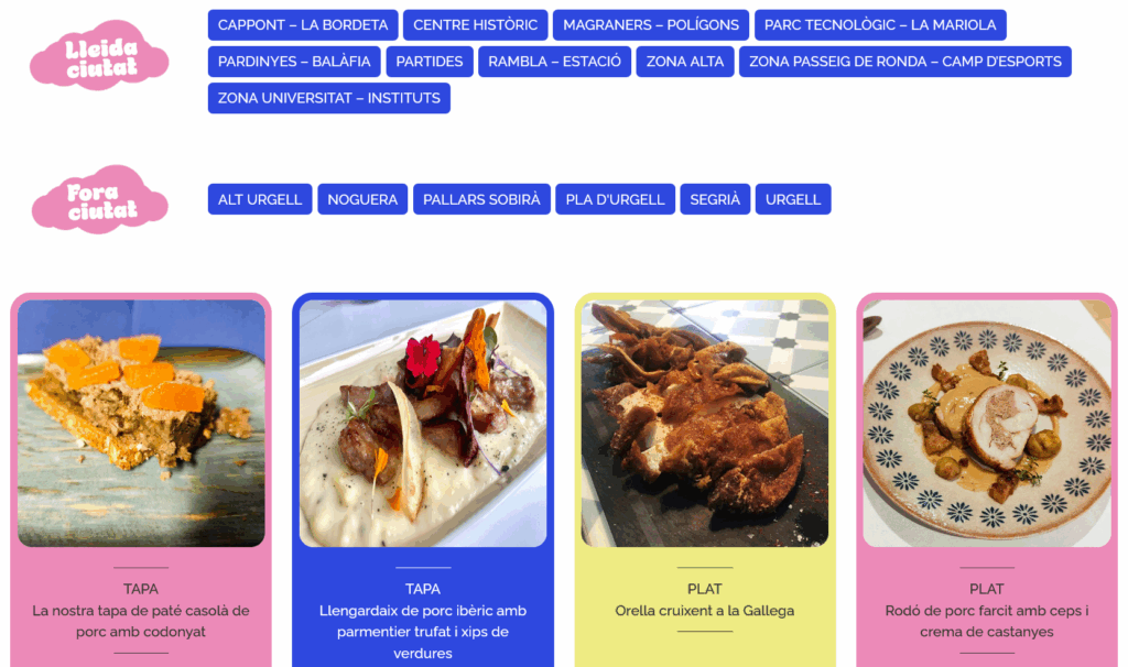 Aquests són els bars i restaurants participants: 4 Llaunes, Abrasas, Aimia, Alveo, Bellera, Bon paladar, Brasa d’Or , Brito’s Casual Bar, Buteko, Cal Benito, Cal Palau, Cal Xirricló, Can Prada, Cantamanyanes, Click Menú, De la Rosa, DeLocos Lleida, DeLocos Tàrrega, Des-tapa’t Coffee Green Bites, El Altar Major, El Bistrot (Hotel Zenit), El Cau, El Celler del Rosér, El Galeó, El Mesón, El Racó de la Gris, Florensa, Fonda Farré, Fuente de Soda, Galindo, Hostal del Carme, Hostal Vall d’Àneu, Hotel Cardós, Hotel NH Pirineos, Ideal, Julián, L’Antiquaritapes, La Ballena, La Boscana, La Gasolinera d’Àger,La Gorgona, La Gramàtica del Vermut, La Martina, La Masia, La Moderna, La Mossadeta, La Santa, L’Espurna, Marc&Kristy, Merxe’s Mil Sabors, New Class Pardinyes, New Class Rovira Roure, Nou Cal Delme, Petit Xiroi, QR Cafè, Santa Gadea, Saroa, Sköll Lounge Bar, Sköll Pool&Beer, Tosca.