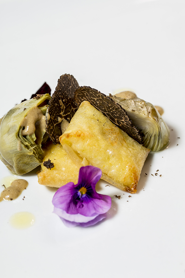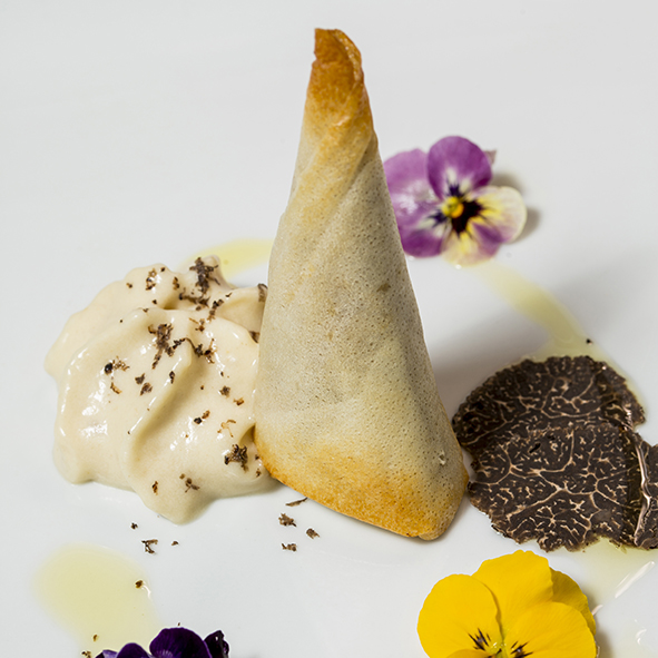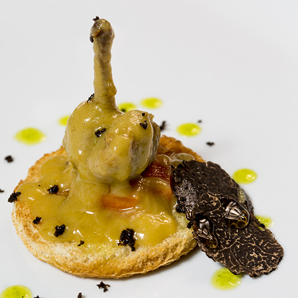 Vichyssoise de almendras trufadas (cafetería Pim Pam); Tortellini de setas con trufa y bechamel (cafetería La Silo); Salmón trufado a la naranja (Sidrería Trasgu); Canelón trufado de brandada de bacalao, alcachofas y crema de ceps (Salones Casanova); Piruleta de ave trufada (restaurante Martín); Meloso de pies de cerdo con risotto de “bulgur” y polvo de aceite de trufa (Espaioró); Crujiente de pollo ecológico del Cinca trufado y espuma de boletus (+ Billauba); Bola de crema de queso con arándanos y trufa (Papachu Degustación); y Mini croissant de crema de tiramisú con trufa y salsa bourbon (bar Galicia) serán las nueve degustaciones que configurarán el menú de este encuentro que organiza la Diputación de Huesca con la colaboración de la Asociación de Recolectores y Cultivadores de Trufa de Aragón y el Ayuntamiento de Fraga.