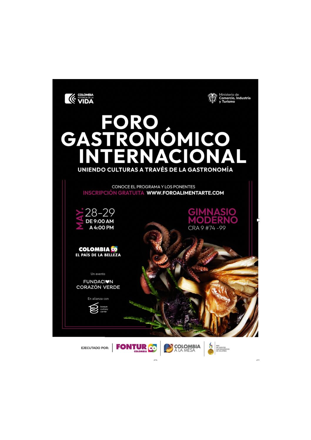 El Fòrum Gastronòmic Internacional d’Alimentarte celebra la seva desena primera edició els dies 28 i 29 de maig de 2024, recolzat pel Ministeri de Comerç, Indústria i Turisme, Fontur, i en col·laboració amb el prestigiós Basque Culinary Center, el principal centre acadèmic i de formació i innovació gastronòmica a nivell mundial. Aquest esdeveniment reuneix líders nacionals i internacionals del sector per abordar els temes més rellevants a la indústria de la gastronomia.